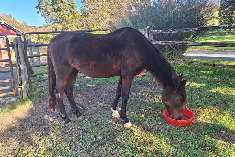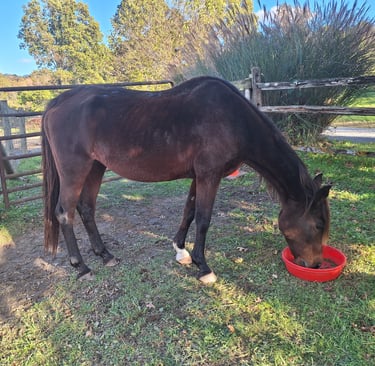 Bella is an aged mare who has Cushings Disease and Lyme Disease. Because of her conditions, she struggles to maintain muscle tone. Her owner could not afford to pay for her medications and care so we partnered with Traveller's Rest Farm Sanctuary to give her a safe landing. She is currently on medications for her conditions and on the rebound. Kindred Souls is her permanent foster home through Traveller's Rest Farm Horse Sanctuary, but we would like to make her our first permanent sanctuary horse and free up a spot at Traveller's Rest for another needy horse. Her care costs include: